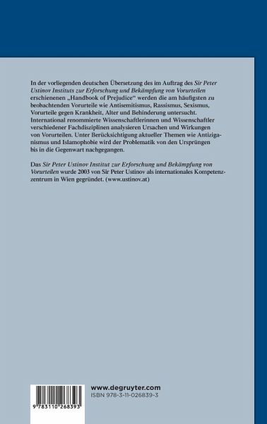 International renommierte Autoren beschreiben und analysieren die wichtigsten Gruppen von Vorurteilen: Antisemitismus, Sexismus, Rassismus, religiöse Vorurteile, Klassenvorurteile, auch Vorurteile gegen Alter, Krankheit, Behinderung. Historische Ursachen und Wirkungen von Vorurteilen werden dabei aus der Perspektive verschiedener Wissenschaftsdisziplinen behandelt. Die deutsche Übersetzung des im Auftrag des Sir Peter Ustinov Instituts zur Erforschung und Bekämpfung von Vorurteilen erschienenen Handbook of Prejudice wird um neue, aktuelle Themen wie Antiziganismus und Islamophobie erweitert.