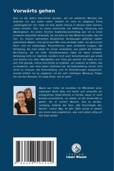 Dies ist die wahre Geschichte darüber, wie ein plötzlicher Moment des Aufpralls mir das Leben nahm. Obwohl ich nicht im religiösen Sinne "wiedergeboren" bin, habe ich eine zweite Chance in diesem Spiel namens Leben erhalten. Dies ist meine Geschichte von Hoffnung, Genesung und Wiedergeburt. An einem frischen Septembernachmittag war ich in einen schweren Autounfall verwickelt, als ein Auto auf das Motorrad prallte, das ich fuhr. Zu meinen zahlreichen körperlichen Verletzungen gehörten sieben gebrochene Rippen, eine gerissene Milz, eine verletzte Leber, ein gerissener Darm und ein beidseitiger Pneumothorax (zwei punktierte Lungen). Die Verletzung, die mein Leben für immer veränderte, war jedoch die Schädel-Hirn-Trauma, die ich erlitt. Glücklicherweise habe ich diese schwere Verletzung nicht nur überlebt, sondern mich auch bemerkenswert gut erholt und komme nun allen Widrigkeiten zum Trotz gut zurecht. Ich habe es mir zum Ziel gesetzt, meine Geschichte zu erzählen, um anderen zu helfen, das zu bewahren, was mein Leben verändert hat: die Entscheidung, immer nach vorne zu schauen. Die Entscheidung, sich an Veränderungen anzupassen, anstatt einfach nur zu reagieren, ist ein sehr mächtiges Werkzeug. Folgen Sie meinem Beispiel. Ich zeige Ihnen, wie es geht!