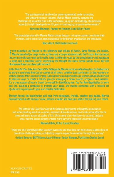 From suburban Los Angeles to the glittering tech offices of Austin, San Francisco, and London, Marnie searched for ways to rise up the ranks of corporate America to the C-suite. Marnie shows how you can take your seat at the table. After climbing her way up the wobbly ladder and navigating a layoff and a pandemic world, everything she thought she knew turned upside down. But, she discovered there is a clear path forward. In the Vote for You: Take Your Seat at the Table guide, Marnie turns an unflinching lens on the barriers to entry in corporate America for women at all levels, whether just starting out in their careers or looking to make their next career leap. She uses her own experiences as a woman and Asian American to address ways to create a holistic plan for managing a career search, progress, and passions. It's a true account of how to invest in yourself by identifying your Top Ten Non-Negotiables in work and life, building a campaign to promote your goals, and staying connected with a trusted set of advisors to guide you to your own charted destination. Through honest self-examination and help from colleagues, friends, coaches, and guides, Marnie demonstrates how to find your voice, become a leader, and take your seat at the table of your choice.