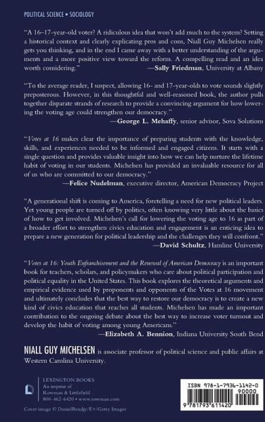 At a time when American political institutions are under intense criticism and facing internal and external pressures, Americans must identify opportunities for changing the status quo. Rather than reject the system as fatally flawed, Niall Guy Michelsen argues that lowering the voting age to 16 will decrease the voting gap between the college and non-college citizens. Increasing voter turnout will make the American electorate more representative of the country and add needed voices to political debates. Dr. Michelsen analyzes the nature of voting habits and concludes that too many citizens start their adult lives as non-voters and become habitual non-voters as a result. Using voter turnout data and demographics, Dr. Michelsen shows that lowering the voting age to 16 would help both college-attending and non-college-attending young adults develop voting habits and raise voter turnout.