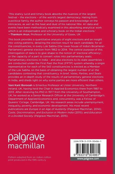 This book provides a quantitative analysis of eight elections and an insight into voting patterns, detailing the election result for each candidate, for all the constituencies, in every Lok Sabha (the lower house of India's Bicameral-Parliament) general election from 1962 to 2014. The central purpose of this interrogation of data is to give shape to the notion of 'electoral efficiency', or the capacity of a party to convert votes into parliamentary seats. Parliamentary elections in India - and also elections to its state assemblies - are conducted under the First Past the Post (FPTP) system whereby a single representative for each of the 543 constituencies is elected as a Member of the Lok Sabha, on the basis of obtaining the largest number of all the candidates contesting that constituency. In brief, Votes, Parties, and Seats provides an in-depth study of the results of parliamentary general elections in India, and sheds light on why some parties are more efficient than others.