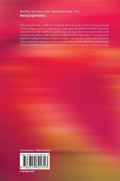 This book presents a collection of papers illustrating the variety of "experimental" methodologies used to study voting. Experimental methods include laboratory experiments in the tradition of political psychology, laboratory experiments with monetary incentives, in the economic tradition, survey experiments (varying survey, question wording, framing or content), as well as various kinds of field experimentation. Topics include the behavior of voters (in particular turnout, vote choice, and strategic voting), the behavior of parties and candidates, and the comparison of electoral rules.