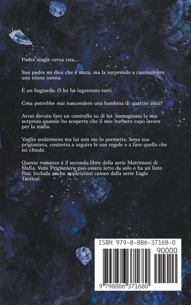 Padre single cerca tata... Suo padre mi dice che è muta, ma la sorprendo a canticchiare una ninna nanna. È un bugiardo. O lei ha ingannato tutti. Cosa potrebbe mai nascondere una bambina di quattro anni? Avrei dovuto fare un controllo su di lui. Immaginate la mia sorpresa quando ho scoperto che il mio burbero capo lavora per la mafia. Voglio andarmene ma lui non me lo permette. Sono sua prigioniera, costretta a seguire le sue regole e a fare quello che mi chiede. Questo romanzo è il secondo libro della serie Matrimoni di Mafia. Voto Prigioniero può essere letto da solo e ha un lieto fine. Include anche apparizioni cameo dalla serie Eagle Tactical.