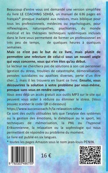 Vous avez été nombreux à demander une version simplifiée du livre LE COACHING SDHEA, manuel en langue française de 636 pages * presque inadapté aux néophytes mais bible pour tous les professionnels, médecin ou psychologues, pour les réflexologues, Naturopathe, psychiatre, du monde médical et de la thérapies techniques systémiques contenues dans le livre permettent toutes de former un professionnel en un délai très court de quelques heures à quelques semaines seulement.Mais ce n'est pas l'objet de cet ouvrage mais plutôt de permettre une relecture de l'ouvrage sous un angle nouveau qui vous concerne et qui débutez.Le lecteur ne cherchera pas de solutions pour son cas personnel (stress, désordres dus à des situations de catastrophes, démoralisation, idée de suicide ou apathie diverses, perte d'un être cher...), mais il les trouvera, s'il lit ce livre. Il découvrira alors lui-même la solution à son problème, presque sans s'en rendre compte.Vous avez déjà accès gratuitement sur le site internet à des outils MP3 qui vous permettront de réduire votre stress ou de l'éliminer. https://www.successcoach.fr/la-relaxation-sdheaDes outils utilisables comme la gestion des émotions, la diététique ou le sport, la maîtrise de la mémoire, la PNL, l'Hypnose Eriksonnienne, la relaxation ou la Sophrologie sur le mode systémique permettent de répondre à la problématique du moment. Ce livre est édité en six langues.