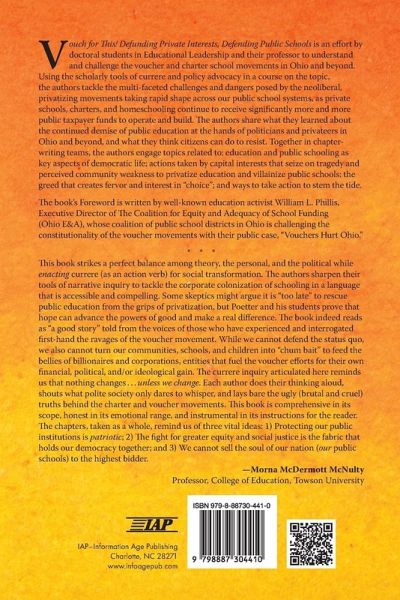 Vouch for This! Defunding Private Interests, Defending Public Schools (A Call to Action) is an effort by doctoral students in Educational Leadership and their professor to understand and challenge the voucher and charter school movements in Ohio and beyond. Using a curriculum studies approach focusing on autobiographical analysis and a policy advocacy framework, students in a course on the topic shared a common reading list, storied their connections to the current movements in the field, and developed treatments of key aspects of current policy and practice in the areas of voucher and other privatizing efforts in education today as they are embodied in charter schools, homeschooling, and private school settings. Using the tools of currere and policy advocacy as a scholarly community, the authors tackle the multi-faceted challenges and dangers posed by the neoliberal, privatizing movements taking rapid shape across our public school system, as private schools, charters, and homeschooling continue to receive significantly more and more public taxpayer funds to operate and build. The authors share what they learned about the continued demise of public education at the hands of politicians and privateers in Ohio and beyond, and what they think citizens can do to resist. Together in teams, the authors engage topics related to education and public schooling as key aspects of democratic life; the actions taken by capital interests that seize on tragedy and perceived community weakness to privatize education and villainize public schools; the greed that creates fervor and interest in "choice"; and suggest ways to take action to stem the tide.The book's foreword is written by well-known education activist William L. Phillis, Executive Director of The Coalition for Equity and Adequacy of School Funding (Ohio E&A), whose coalition of public school districts in Ohio is challenging the constitutionality of the voucher movements with their public case, "Vouchers Hurt Ohio."