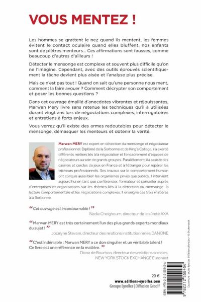 Les hommes se grattent le nez quand ils mentent, les femmes évitent le contact oculaire quand elles bluffent, nos enfants sont de piètres menteurs... Ces affirmations sont fausses, comme beaucoup d'autres d'ailleurs !Détecter le mensonge est complexe et souvent plus difficile qu'on ne l'imagine. Cependant, avec des outils éprouvés scientifiquement la tâche devient plus aisée et l'analyse plus précise.Mais ce n'est pas tout ! Quand on sait qu'une personne nous ment, comment la faire avouer ? Comment décrypter son comportement et poser les bonnes questions ?Dans cet ouvrage émaillé d'anecdotes vibrantes et réjouissantes, Marwan Mery livre sans retenue les techniques qu'il a utilisées durant vingt ans lors de négociations complexes, interrogatoires et entretiens à forts enjeux.Vous verrez qu'il existe des armes redoutables pour détecter le mensonge, démasquer les menteurs et obtenir la vérité."Cet ouvrage est incontournable !"Nadia Chelghoum, directeur de la sûreté AXA"Marwan MERY est très certainement l'un des plus grands experts mondiaux du sujet !"Jocelyne Stevani, directeur des relations institutionnelles DANONE"C'est indéniable: Marwan MERY a ce don singulier et un véritable talent ! Ce livre est une référence en la matière." Diana de Bourbon, directeur des relations sociales, NEW YORK STOCK EXCHANGE Euronext