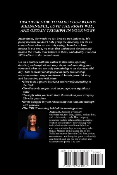 Many times, the words we say bear no true influence. It's partly because we don't fully grasp the meaning, nor do we comprehend what we are truly saying. In order to have impact in our vows, we must first understand the meaning behind the words, truly believe in them, and identify if we can 100%% adhere to the commitment. Go on a journey with the author in this mind-opening, detailed, and inspirational story about understanding your vows and what you are truly committing to on that beautiful day. This is meant for all people in every relationship transition-from single to divorced. In this powerful story and instruction, you will learn: how to be a potent husband and/or wife according to the Bible, to effectively support and encourage your significant other, to apply what you learn from this book in your everyday life with questions, every struggle in your relationship can turn into triumph with patience, and the TRUE meaning behind the marriage vows.