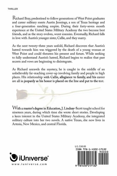 Richard Bray, predestined to follow generations of West Point graduates and career military meets Austin Jennings, a son of Texas heritage and a four-generation ranching empire. During their forty-seven month experience at the United States Military Academy the two become best friends, and as the story evolves, worst enemies. Eventually, Richard falls in love with Austin's younger sister, Callie, and they marry. As the next twenty-three years unfold, Richard discovers that Austin's hatred towards him was triggered by the death of a young woman at West Point and could threaten his present and future. While seeking to fully understand Austin's hatred, Richard begins to realize that past secrets and vows are beginning to disintegrate. As Richard unravels the mystery, he is caught in the middle of an unbelievably far-reaching cover-up involving family and people in high places. His relationship with Callie, allegiance to the family, and his career are all in jeopardy as his honor is placed on the line and put to the test.