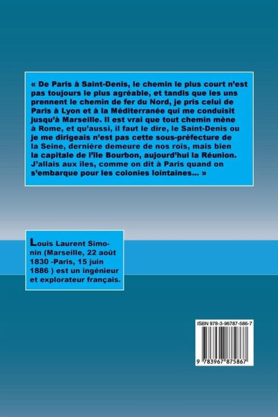 De Paris à Saint-Denis, le chemin le plus court n'est pas toujours le plus agréable, et tandis que les uns prennent le chemin de fer du Nord, je pris celui de Paris à Lyon et à la Méditerranée qui me conduisit jusqu'à Marseille. Il est vrai que tout chemin mène à Rome, et qu'aussi, il faut le dire, le Saint-Denis ou je me dirigeais n'est pas cette sous-préfecture de la Seine, dernière demeure de nos rois, mais bien la capitale de l'île Bourbon, aujourd'hui la Réunion. J'allais aux îles, comme on dit à Paris quand on s'embarque pour les colonies lointaines...