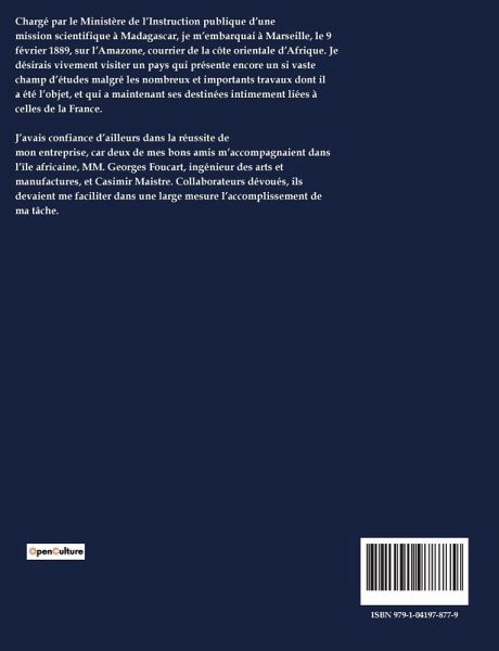 Chargé par le Ministère de l¿Instruction publique d¿une mission scientifique à Madagascar, je m¿embarquai à Marseille, le 9 février 1889, sur l¿Amazone, courrier de la côte orientale d¿Afrique. Je désirais vivement visiter un pays qui présente encore un si vaste champ d¿études malgré les nombreux et importants travaux dont il a été l¿objet, et qui a maintenant ses destinées intimement liées à celles de la France. J¿avais confiance d¿ailleurs dans la réussite de mon entreprise, car deux de mes bons amis m¿accompagnaient dans l¿île africaine, MM. Georges Foucart, ingénieur des arts et manufactures, et Casimir Maistre. Collaborateurs dévoués, ils devaient me faciliter dans une large mesure l¿accomplissement de ma tâche.