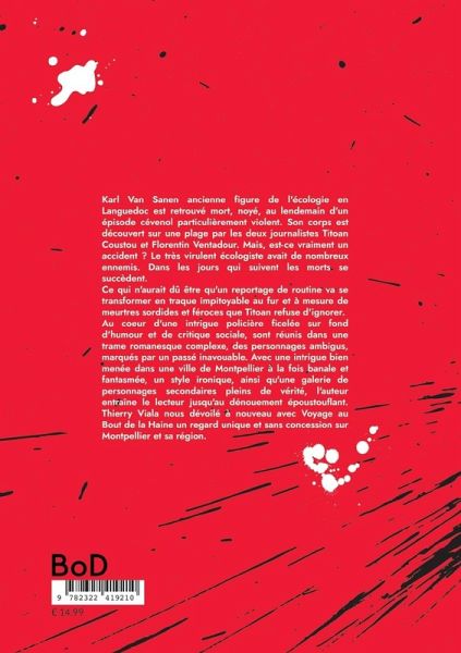 Karl Van Sanen ancienne figure de l'écologie en Languedoc est retrouvé mort, noyé, au lendemain d'un épisode cévenol particulièrement violent. Son corps est découvert sur une plage par les deux journalistes Titoan Coustou et Florentin Ventadour. Mais, est-ce vraiment un accident ? Le très virulent écologiste avait de nombreux ennemis. Dans les jours qui suivent les morts se succèdent.Ce qui n'aurait dû être qu'un reportage de routine va se transformer en traque impitoyable au fur et à mesure de meurtres sordides et féroces que Titoan refuse d'ignorer.Au coeur d'une intrigue policière ficelée sur fond d'humour et de critique sociale, sont réunis dans une trame romanesque complexe, des personnages ambigus, marqués par un passé inavouable. Avec une intrigue bien menée dans une ville de Montpellier à la fois banale et fantasmée, un style ironique, ainsi qu'une galerie de personnages secondaires pleins de vérité, l'auteur entraîne le lecteur jusqu'au dénouement époustouflant. Thierry Viala nous dévoilé à nouveau avec Voyage au Bout de la Haine un regard unique et sans concession sur Montpellier et sa région.