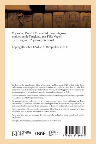 Voyage au Bresil / Mme et M. Louis Agassiz; traduction de l'anglais... par Felix VogeliTitre original: A journey in BrazilCe livre est la reproduction fidele d'une oeuvre publiee avant 1920 et fait partie d'un projet propose par la Bibliotheque nationale de France (BnF), offrant l'opportunite pour les lecteurs, enseignants ou chercheurs d'acceder a des ouvrages anciens et souvent rares issus de ses fonds patrimoniaux.Les oeuvres de cette collection appartiennent au domaine public . Elles ont ete numerisees par la BnF et sont presentes sur Gallica, la bibliotheque numerique de la BnF.En entreprenant de redonner vie a ces oeuvres au travers d'une collection de livres reimprimes a la demande, nous offrons la possibilite a ces oeuvres de rencontrer un public elargi et participons a la transmission de connaissances et de savoirs difficilement accessibles par ailleurs.Sur un plan technique, nous avons cherche a concilier la reproduction fidele d'un livre ancien a partir de sa version numerisee avec le souci d'un confort de lecture optimal. Nous esperons que les ouvrages de cette nouvelle collection vous apporteront entiere satisfaction.http: //gallica.bnf.fr/ark: /12148/bpt6k62336134