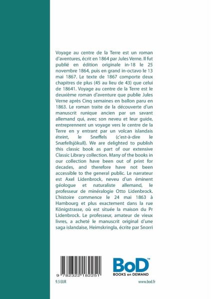 Voyage au centre de la Terre est un roman d'aventures, écrit en 1864 par Jules Verne. Il fut publié en édition originale in-18 le 25 novembre 1864, puis en grand in-octavo le 13 mai 1867. Le texte de 1867 comporte deux chapitres de plus (45 au lieu de 43) que celui de 18641. Voyage au centre de la Terre est le deuxième roman d'aventure que publie Jules Verne après Cinq semaines en ballon paru en 1863. Le roman traite de la découverte d'un manuscrit runique ancien par un savant allemand qui, avec son neveu et leur guide, entreprennent un voyage vers le centre de la Terre en y entrant par un volcan islandais éteint, le Sneffels (c'est-à-dire le Snæfellsjökull). We are delighted to publish this classic book as part of our extensive Classic Library collection. Many of the books in our collection have been out of print for decades, and therefore have not been accessible to the general public. Le narrateur est Axel Lidenbrock, neveu d'un éminent géologue et naturaliste allemand, le professeur de minéralogie Otto Lidenbrock. L'histoire commence le 24 mai 1863 à Hambourg et plus exactement dans la rue Königstrasse, où est située la maison du Pr Lidenbrock. Le professeur, amateur de vieux livres, a acheté le manuscrit original d'une saga islandaise, Heimskringla, écrite par Snorri Sturluson au XIIe siècle. Il y découvre un parchemin codé, rédigé en caractères runiques islandais. Lidenbrock se passionne aussitôt pour ce cryptogramme et tyrannise toute la maison tant qu'il lui résiste. Axel, d'abord peu enthousiaste, se prend peu à peu au jeu et finit par découvrir la clé du message par un coup de chance. Le parchemin se révèle être un message d'un certain Arne Saknussemm, un alchimiste islandais du XVIe siècle, rédigé en latin mais écrit en runes. Celui-ci affirme avoir découvert un passage qui l'aurait mené jusqu'au centre de la Terre, via l'un des cratères d'un volcan éteint d'Islande, le Sneffels (l'actuel Snæfellsjökull). Le professeur Otto Lidenbrock est un homme enthousiaste et impétueux. Il décide de partir dès le lendemain pour l'Islande, emmenant avec lui son neveu Axel, beaucoup plus réticent. L'oncle et le neveu sont en désaccord sur la possibilité pratique d'un tel voyage, qui va à l'encontre de la théorie la plus répandue sur la composition de l'intérieur de la planète, la théorie de la chaleur centrale, soutenue notamment par Siméon Denis Poisson : Axel s'en fait le défenseur, tandis que Lidenbrock, plus influencé par les théories de Humphry Davy selon
