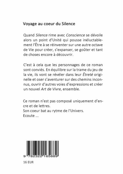Quand Silence rime avec Conscience se dévoile alors un point d'Unité qui pousse inéluctablement l'Être à se réinventer sur une autre octave de Vie pour créer, s'expanser, se goûter et tant de choses encore à découvrir. C'est à cela que les personnages de ce roman sont conviés. En équilibre sur la trame du jeu de la vie, ils vont se révéler dans leur Êtreté originelle et oser s'aventurer sur des chemins inconnus, ouvrir d'autres voies d'expressions et créer un nouvel Art de Vivre, ensemble.