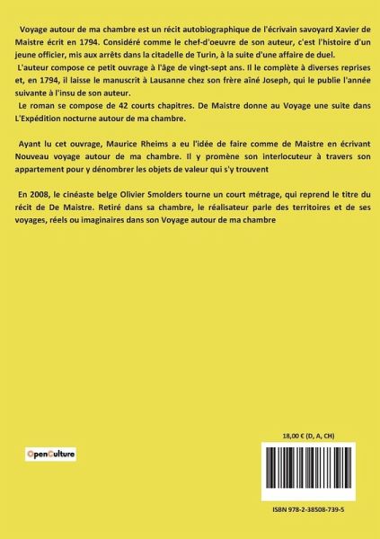 Voyage autour de ma chambre est un récit autobiographique de l'écrivain savoyard Xavier de Maistre écrit en 1794. Considéré comme le chef-d'oeuvre de son auteur, c'est l'histoire d'un jeune officier, mis aux arrêts dans la citadelle de Turin, à la suite d'une affaire de duel. L'auteur compose ce petit ouvrage à l'âge de vingt-sept ans. Il le complète à diverses reprises et, en 1794, il laisse le manuscrit à Lausanne chez son frère aîné Joseph, qui le publie l'année suivante à l'insu de son auteur. Le roman se compose de 42 courts chapitres. De Maistre donne au Voyage une suite dans L'Expédition nocturne autour de ma chambre. Ayant lu cet ouvrage, Maurice Rheims a eu l'idée de faire comme de Maistre en écrivant Nouveau voyage autour de ma chambre. Il y promène son interlocuteur à travers son appartement pour y dénombrer les objets de valeur qui s'y trouvent En 2008, le cinéaste belge Olivier Smolders tourne un court métrage, qui reprend le titre du récit de De Maistre. Retiré dans sa chambre, le réalisateur parle des territoires et de ses voyages, réels ou imaginaires dans son Voyage autour de ma chambre