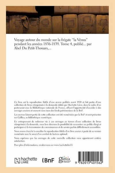 Voyage autour du monde sur la frégate "la Vénus" pendant les années 1836-1839. Tome 4 /, publié... par Abel Du Petit-Thouars, ... Date de l'édition originale: 1840-1864 Comprend: Botanique; Zoologie... Oiseaux...; Zoologie... Reptiles...; Physique...; Zoologie... Poissons; Zoologie... Oiseaux...; Zoologie. Mammifères Le présent ouvrage s'inscrit dans une politique de conservation patrimoniale des ouvrages de la littérature Française mise en place avec la BNF. HACHETTE LIVRE et la BNF proposent ainsi un catalogue de titres indisponibles, la BNF ayant numérisé ces oeuvres et HACHETTE LIVRE les imprimant à la demande. Certains de ces ouvrages reflètent des courants de pensée caractéristiques de leur époque, mais qui seraient aujourd'hui jugés condamnables. Ils n'en appartiennent pas moins à l'histoire des idées en France et sont susceptibles de présenter un intérêt scientifique ou historique. Le sens de notre démarche éditoriale consiste ainsi à permettre l'accès à ces oeuvres sans pour autant que nous en cautionnions en aucune façon le contenu. Pour plus d'informations, rendez-vous sur www.hachettebnf.fr