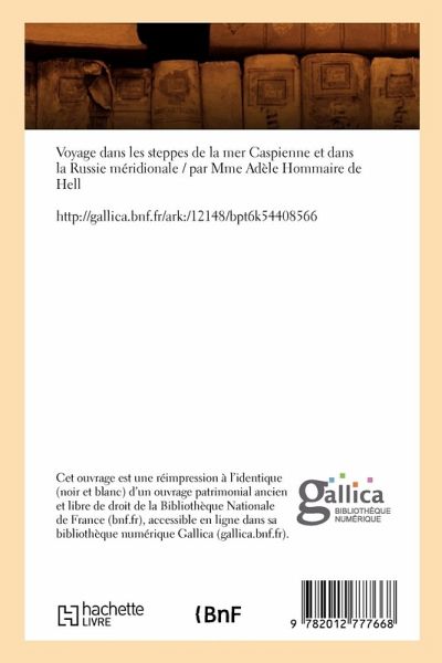 Voyage dans les steppes de la mer Caspienne et dans la Russie meridionale / par Mme Adele Hommaire de HellDate de l'edition originale: 1860Sujet de l'ouvrage: Steppes -- RussieSteppes -- KazakhstanCe livre est la reproduction fidele d'une oeuvre publiee avant 1920 et fait partie d'une collection de livres reimprimes a la demande editee par Hachette Livre, dans le cadre d'un partenariat avec la Bibliotheque nationale de France, offrant l'opportunite d'acceder a des ouvrages anciens et souvent rares issus des fonds patrimoniaux de la BnF.Les oeuvres faisant partie de cette collection ont ete numerisees par la BnF et sont presentes sur Gallica, sa bibliotheque numerique.En entreprenant de redonner vie a ces ouvrages au travers d'une collection de livres reimprimes a la demande, nous leur donnons la possibilite de rencontrer un public elargi et participons a la transmission de connaissances et de savoirs parfois difficilement accessibles.Nous avons cherche a concilier la reproduction fidele d'un livre ancien a partir de sa version numerisee avec le souci d'un confort de lecture optimal. Nous esperons que les ouvrages de cette nouvelle collection vous apporteront entiere satisfaction.Pour plus d'informations, rendez-vous sur www.hachettebnf.frhttp: //gallica.bnf.fr/ark: /12148/bpt6k54408566