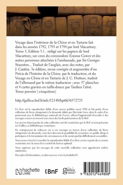 Voyage dans l'intérieur de la Chine et en Tartarie fait dans les années 1792, 1793 et 1794 par lord Macartney. Tome 5, Edition 3 / ... rédigé sur les papiers de lord Macartney, sur ceux du commodore Érasme Gower et des autres personnes attachées à l'ambassade, par Sir Georges Staunton... Traduit de l'anglais, avec des notes, par J. Castéra. 3e édition, revue corrigée et augmentée d'un Précis de l'histoire de la Chine, par le traducteur, et du Voyage en Chine et en Tartarie de J. C. Huttner, traduit de l'allemand par le même traducteur; avec 37 planches et 4 cartes gravées en taille-douce par Tardieu l'aîné. Tome premier [-cinquième] Date de l'édition originale: 1804 Titre original: An authentic account of an embassy from the King of Great Britain to the Emperor of ChinaComprend: Précis de l'histoire de la Chine; Voyage en Chine et en Tartarie Le présent ouvrage s'inscrit dans une politique de conservation patrimoniale des ouvrages de la littérature Française mise en place avec la BNF. HACHETTE LIVRE et la BNF proposent ainsi un catalogue de titres indisponibles, la BNF ayant numérisé ces oeuvres et HACHETTE LIVRE les imprimant à la demande. Certains de ces ouvrages reflètent des courants de pensée caractéristiques de leur époque, mais qui seraient aujourd'hui jugés condamnables. Ils n'en appartiennent pas moins à l'histoire des idées en France et sont susceptibles de présenter un intérêt scientifique ou historique. Le sens de notre démarche éditoriale consiste ainsi à permettre l'accès à ces oeuvres sans pour autant que nous en cautionnions en aucune façon le contenu. Pour plus d'informations, rendez-vous sur www.hachettebnf.fr