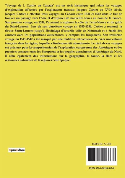 "Voyage de J. Cartier au Canada" est un récit historique qui relate les voyages d'exploration effectués par l'explorateur français Jacques Cartier au XVIe siècle. Jacques Cartier a effectué trois voyages au Canada entre 1534 et 1542 dans le but de trouver un passage vers l'Asie et d'explorer de nouvelles terres au nom de la France. Son premier voyage, en 1534, l'a amené à explorer la côte de Terre-Neuve et du golfe du Saint-Laurent. Lors de son deuxième voyage en 1535-1536, Cartier a remonté le fleuve Saint-Laurent jusqu'à Hochelaga (l'actuelle ville de Montréal) et a établi des contacts avec les populations autochtones, y compris les Iroquoiens. Son troisième voyage en 1541-1542 a été marqué par une tentative infructueuse de créer une colonie française dans la région, laquelle a finalement été abandonnée. Le récit de ces voyages est précieux pour la compréhension de l'exploration européenne des Amériques et des premiers contacts entre les Européens et les peuples autochtones d'Amérique du Nord. Il offre également des informations sur la géographie, la faune, la flore et les ressources naturelles de la région à cette époque.