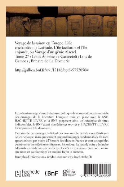 Voyage de la raison en Europe. L'île enchantée: la Luisiade. L'île taciturne et l'île enjouée, ou Voyage d'un génie Alacrel. Tome 27 / Louis-Antoine de Caraccioli; Luis de Camões; Bricaire de La Dixmerie Date de l'édition originale: 1788 Le présent ouvrage s'inscrit dans une politique de conservation patrimoniale des ouvrages de la littérature Française mise en place avec la BNF. HACHETTE LIVRE et la BNF proposent ainsi un catalogue de titres indisponibles, la BNF ayant numérisé ces oeuvres et HACHETTE LIVRE les imprimant à la demande. Certains de ces ouvrages reflètent des courants de pensée caractéristiques de leur époque, mais qui seraient aujourd'hui jugés condamnables. Ils n'en appartiennent pas moins à l'histoire des idées en France et sont susceptibles de présenter un intérêt scientifique ou historique. Le sens de notre démarche éditoriale consiste ainsi à permettre l'accès à ces oeuvres sans pour autant que nous en cautionnions en aucune façon le contenu. Pour plus d'informations, rendez-vous sur www.hachettebnf.fr