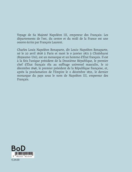 Voyage de Sa Majesté Napoléon III, empereur des Français: Les départements de l'est, du centre et du midi de la France est une oeuvre écrite par François Laurent. Charles Louis Napoléon Bonaparte, dit Louis-Napoléon Bonaparte, né le 20 avril 1808 à Paris et mort le 9 janvier 1873 à Chislehurst (Royaume-Uni), est un monarque et un homme d'État français. Il est à la fois l'unique président de la Deuxième République, le premier chef d'État français élu au suffrage universel masculin, le 10 décembre 1848, le premier président de la République française, et, après la proclamation de l'Empire le 2 décembre 1852, le dernier monarque du pays sous le nom de Napoléon III, empereur des Français.