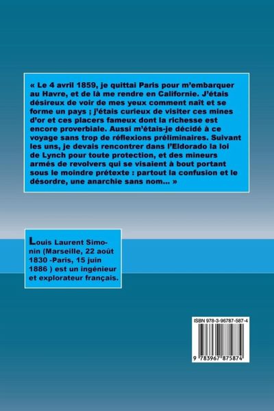 Le 4 avril 1859, je quittai Paris pour m'embarquer au Havre, et de là me rendre en Californie. J'étais désireux de voir de mes yeux comment naît et se forme un pays ; j'étais curieux de visiter ces mines d'or et ces placers fameux dont la richesse est encore proverbiale. Aussi m'étais-je décidé à ce voyage sans trop de réflexions préliminaires. Suivant les uns, je devais rencontrer dans l'Eldorado la loi de Lynch pour toute protection, et des mineurs armés de revolvers qui se visaient à bout portant sous le moindre prétexte : partout la confusion et le désordre, une anarchie sans nom...
