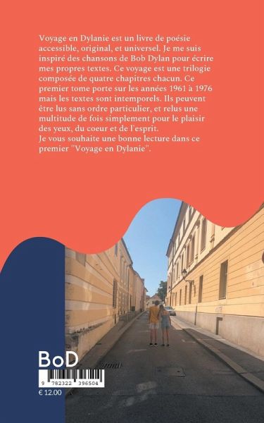 Voyage en Dylanie est un livre de poésie accessible, original, et universel. Je me suis inspiré des chansons de Bob Dylan pour écrire mes propres textes. Ce voyage est une trilogie composé de quatre chapitres chacun. Ce premier tome porte sur les années 1961 à 1976 mais les textes sont intemporels, ils peuvent être lus sans ordre particulier, et relus une multitude de fois simplement pour le plaisir des yeux, du coeur et de l'esprit.Je vous souhaite une bonne lecture pour ce premier voyage en Dylanie.