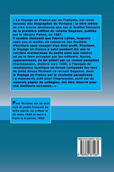 « Le Voyage en France par un Français, est resté inconnu des biographes de Verlaine ; le titre même ne s'en trouve mentionné que sur le feuillet liminaire de la première édition du volume Sagesse, publiée par le libraire Palmé, en 1881. Il semble étonnant que Pauvre Lélian, toujours sans sou ni maille, ait conservé des feuillets d'écriture sans essayer d'en tirer profit. Pourtant, le Voyage en France a suivi pendant dix ans la carrière aventureuse du poète sans que celui-ci ait pu le faire accepter par les éditeurs. Aucun, apparemment, ne fut séduit par ce violent pamphlet réactionnaire, élaboré vers 1880, à l'époque de renaissance mystique où furent composés les vers de piété douce formant ce recueil Sagesse, dont le Voyage en France est la virulente paraphrase. Le manuscrit, prêt pour l'impression, écrit sur du mauvais papier de collégien, dut être réservé pour une meilleure occasion...»