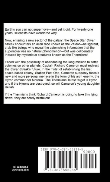 Earth's sun cannot supernova-and yet it did. For twenty-one years, scientists have wondered why. Now, entering a new sector of the galaxy, the Space Star Silver Streak encounters an alien race known as the Valdor-belligerent, crab-like beings who reveal the astonishing information that the supernova was no natural phenomenon-but was deliberately induced by mysterious creatures known as the Thermians! Faced with the possibility of abandoning the long mission to settle colonies on other planets, Captain Richard Cameron must redirect the Silver Streak's future. In the midst of establishing the first space-based colony, Station Post One, Cameron suddenly faces a new and more personal menace in the form of his arch enemy, the Hyron commander Mordrax. The Thermians' latest target is Hyron, and if the Hyrons are destroyed, so will Cameron's young daughter Keilah. If the Thermians think Richard Cameron is going to take this lying down, they are sorely mistaken!