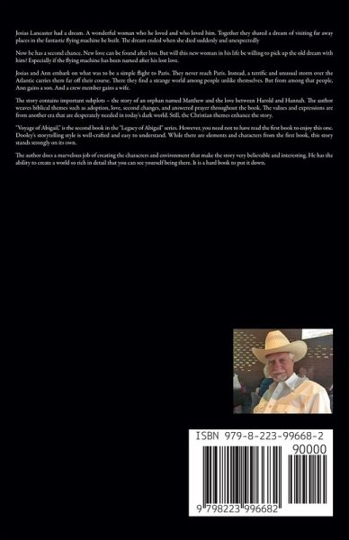 IA Steampunk romantaasy adventure novel. Josias Lancaster had a dream. A wonderful woman who he loved and who loved him. Together they shared a dream of visiting far away places in the fantastic flying machine he built. The dream ended when she died suddenly and unexpectedly Now he has a second chance. New love can be found after loss. But will this new woman in his life be willing to pick up the old dream with him? Especially if the flying machine has been named after his lost love. Josias and Ann embark on what was to be a simple flight to Paris. They never reach Paris. Instead, a terrific and unusual storm over the Atlantic carries them far off their course. There they find a strange world among people unlike themselves. But from among that people, Ann gains a son. And a crew member gains a wife. The story contains important subplots - the story of an orphan named Matthew and the love between Harold and Hannah. The author weaves biblical themes such as adoption, love, second changes, and answered prayer throughout the book. The values and expressions are from another era that are desperately needed in today's dark world. Still, the Christian themes enhance the story. "Voyage of Abigail," is the second book in the "Legacy of Abigail" series. However, you need not to have read the first book to enjoy this one. Dooley's storytelling style is well-crafted and easy to understand. While there are elements and characters from the first book, this story stands strongly on its own. The author does a marvelous job of creating the characters and environment that make the story very believable and interesting. He has the ability to create a world so rich in detail that you can see yourself being there. It is a hard book to put it down. (An excerpt from the book) ------ Ann Lancaster awoke in a fright. Something was wrong. She felt herself about to be tossed from the bed. Laying on her back, with her right hand, she punched Josias who was sleeping next to her. The tossing from the bed did not happen, but the fear of it remained. Shocked out of a deep sleep, he awoke and instantly sat up in bed. Then he almost fell over, and would have, had he not thrown out both hands against the mattress to steady himself. The ship was rolling. Rolling severely from side to side. Against the closed window panes behind them, the whistle of angry winds buffeted the glass. They were flying above the ocean through the midst of a storm. And it was no meek storm. The ship was swinging from side to side, and now a hard bump jolted it, and sent Ann's heart pounding with fear. "What's happening, Honey?" she asked, in a hoarse whisper. "A storm," he answered, in the low whispery quality which was his voice. "It seems to be a big one."