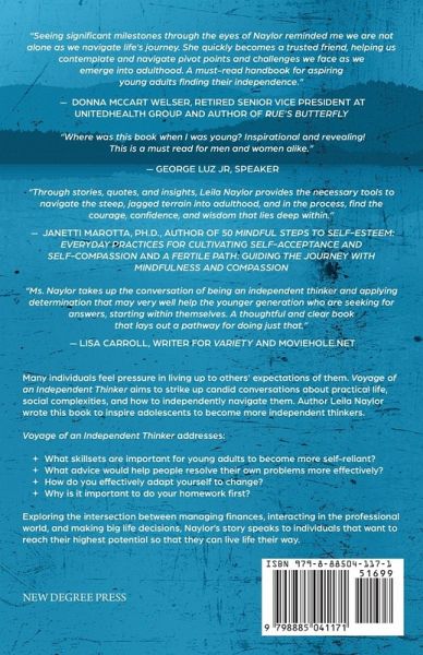 Many individuals feel pressure in living up to others' expectations of them. Voyage of an Independent Thinker aims to strike up candid conversations about practical life, social complexities, and how to independently navigate them. Author Leila Naylor wrote this book to inspire adolescents to become more independent thinkers. Voyage of an Independent Thinker addresses:What skillsets are important for young adults to obtain to become more self-reliant? What advice would help people resolve their own problems more effectively? How do you effectively adapt yourself to change? Why is it important to do your homework first? Exploring the intersection between managing finances, interacting in the professional world, and making big life decisions, Naylor's story speaks to individuals that want to reach their highest potential so that they can live their life their way.
