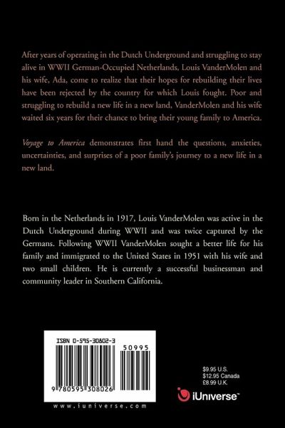 After years of operating in the Dutch Underground and struggling to stay alive in WWII German-Occupied Netherlands, Louis VanderMolen and his wife, Ada, come to realize that their hopes for rebuilding their lives have been rejected by the country for which Louis fought. Poor and struggling to rebuild a new life in a new land, VanderMolen and his wife waited six years for their chance to bring their young family to America. Voyage to America demonstrates first hand the questions, anxieties, uncertainties, and surprises of a poor family's journey to a new life in a new land.
