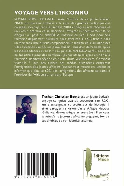 VOYAGE VERS L'INCONNU relate l'histoire de ce jeune ivoirien MALIK qui devenu orphelin à la suite des guerres civiles qui ont ravagées son pays dans les années 2000 et déçus par le chômage et un avenir incertain va se décider à immigrer clandestinement faute d'argent au pays de MANDELA, l'Afrique du Sud. Il doit pour cela traverser illégalement plusieurs villes africaines. Il nous brosse dans un récit sans filtre et sans complaisance un tableau de la situation des villes africaines vue par un jeune africain plus d'un demi siècle après les indépendances et de la vie au pays de MANDELA après l'abolition de l'apartheid pour des nombreux jeunes africains ayant dit non à la traversée méditerranéenne en quête d'une ville meilleure. Comment vivent-ils ? Loin des clichés des médias européens exagérant l'immigration des jeunes africains l'auteur veut mettre en lumière et informer que plus de 60% des immigrations des africains se passe à l'intérieur de l'Afrique et non vers l'Europe .