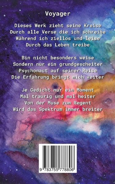 Dieses Werk zieht seine KreiseDurch alle Verse die ich schreibeWährend ich ziellos und leiseDurch das Leben treibeBin nicht besonders weiseSondern nur ein grundgescheiterPsychonaut auf seiner ReiseDie Erfahrung bringt mich weiterJe Gedicht nur ein MomentMal traurig und mal heiterVon der Muse zum RegentWird das Spektrum immer breiter