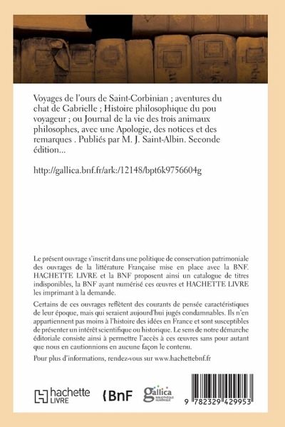 Voyages de l'ours de Saint-Corbinian; aventures du chat de Gabrielle; Histoire philosophique du pou voyageur; ou Journal de la vie des trois animaux philosophes, avec une Apologie, des notices et des remarques . Publiés par M. J. Saint-Albin. Seconde édition... Date de l'édition originale: 1825 Le présent ouvrage s'inscrit dans une politique de conservation patrimoniale des ouvrages de la littérature Française mise en place avec la BNF. HACHETTE LIVRE et la BNF proposent ainsi un catalogue de titres indisponibles, la BNF ayant numérisé ces oeuvres et HACHETTE LIVRE les imprimant à la demande. Certains de ces ouvrages reflètent des courants de pensée caractéristiques de leur époque, mais qui seraient aujourd'hui jugés condamnables. Ils n'en appartiennent pas moins à l'histoire des idées en France et sont susceptibles de présenter un intérêt scientifique ou historique. Le sens de notre démarche éditoriale consiste ainsi à permettre l'accès à ces oeuvres sans pour autant que nous en cautionnions en aucune façon le contenu. Pour plus d'informations, rendez-vous sur www.hachettebnf.fr