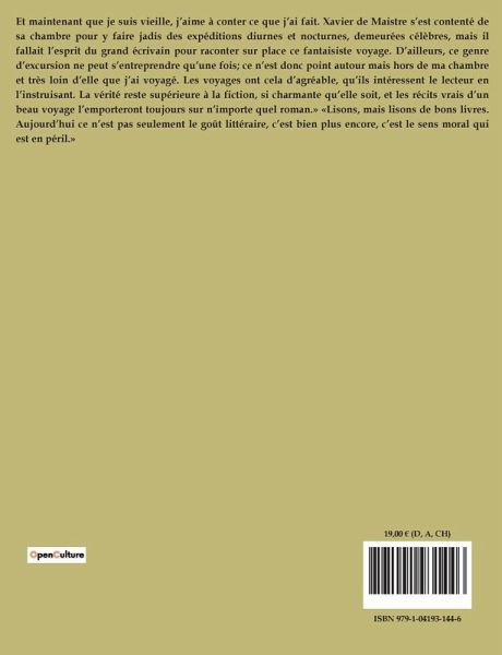 Et maintenant que je suis vieille, j¿aime à conter ce que j¿ai fait. Xavier de Maistre s¿est contenté de sa chambre pour y faire jadis des expéditions diurnes et nocturnes, demeurées célèbres, mais il fallait l¿esprit du grand écrivain pour raconter sur place ce fantaisiste voyage. D¿ailleurs, ce genre d¿excursion ne peut s¿entreprendre qüune fois; ce n¿est donc point autour mais hors de ma chambre et très loin d¿elle que j¿ai voyagé. Les voyages ont cela d¿agréable, qüils intéressent le lecteur en l¿instruisant. La vérité reste supérieure à la fiction, si charmante qüelle soit, et les récits vrais d¿un beau voyage l¿emporteront toujours sur n¿importe quel roman.» «Lisons, mais lisons de bons livres. Aujourd¿hui ce n¿est pas seulement le goût littéraire, c¿est bien plus encore, c¿est le sens moral qui est en péril.»