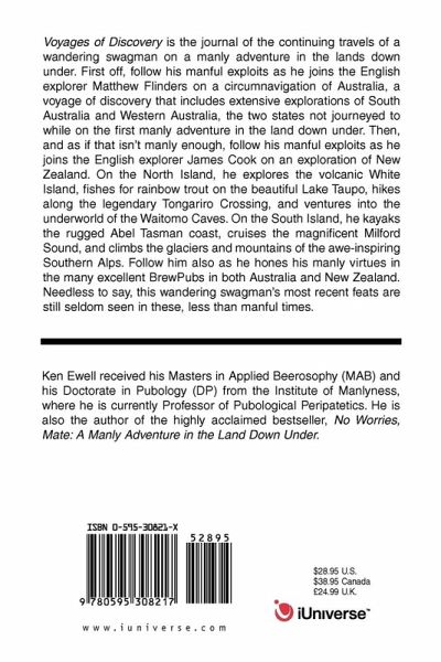 Voyages of Discovery is the journal of the continuing travels of a wandering swagman on a manly adventure in the lands down under. First off, follow his manful exploits as he joins the English explorer Matthew Flinders on a circumnavigation of Australia, a voyage of discovery that includes extensive explorations of South Australia and Western Australia, the two states not journeyed to while on the first manly adventure in the land down under. Then, and as if that isn't manly enough, follow his manful exploits as he joins the English explorer James Cook on an exploration of New Zealand. On the North Island, he explores the volcanic White Island, fishes for rainbow trout on the beautiful Lake Taupo, hikes along the legendary Tongariro Crossing, and ventures into the underworld of the Waitomo Caves. On the South Island, he kayaks the rugged Abel Tasman coast, cruises the magnificent Milford Sound, and climbs the glaciers and mountains of the awe-inspiring Southern Alps. Follow him also as he hones his manly virtues in the many excellent BrewPubs in both Australia and New Zealand. Needless to say, this wandering swagman's most recent feats are still seldom seen in these, less than manful times.