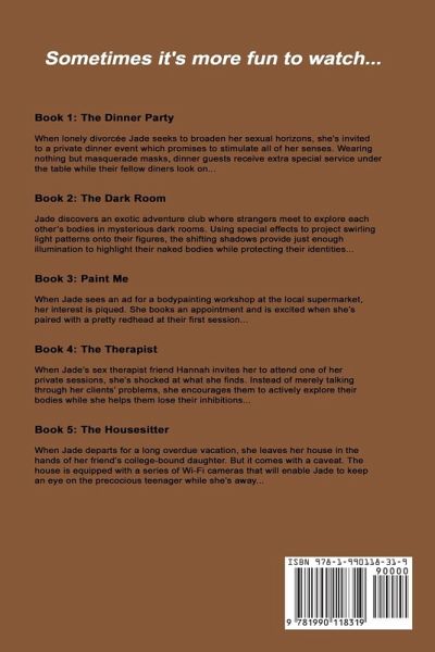 Sometimes it's more fun to watch... Book 1: The Dinner Party When lonely divorcée Jade seeks to broaden her sexual horizons, she's invited to a private dinner event which promises to stimulate all of her senses. Wearing nothing but masquerade masks, dinner guests receive extra special service while their fellow diners look on. During the feast, she watches with increasing arousal as an exotic mix of naked men and women are pleasured under the table by mysterious sensualists. When her turn finally arrives, Jade is aching in anticipation of what surprises lie in wait, while eight strangers watch her have the erotic experience of her life... Book 2: The Dark Room Jade discovers an exotic adventure club where strangers meet to explore each other's bodies in mysterious dark rooms. Using special effects to project swirling light patterns onto their figures, the shifting shadows provide just enough illumination to highlight their naked bodies while protecting their identities. She books an appointment and on the scheduled date drives out to a private countryside villa. She's escorted to a chamber where three large glass cubes display different groups of people under changing light effects. Jade watches the figures touching each other in the mesmerizing glow and decides to enter the first cube... Book 3: Paint Me When Jade sees an ad for a bodypainting workshop at the local supermarket, her interest is piqued. She books an appointment and is excited when she's paired with a pretty redhead at their first session. As Jade begins painting Bree's body and the two exchange playful banter, she finds herself growing increasingly attracted to the girl. By the end of the workshop, both women are at a fever pitch of excitement... Book 4: The Therapist When Jade's sex therapist friend Hannah invites her to attend one of her private sessions, she's shocked at what she finds. Instead of merely talking through her clients' problems, she encourages them to actively explore their bodies while she helps them lose their inhibitions. During the initial session, Jade hides in a secluded location while a young college coed touches herself behind a private screen. As she listens to Hannah guiding the girl through her process of self-discovery, she becomes increasingly aroused in the privacy of her broom closet. But when Hannah asks the girl if she's ready to move on to a partnered session, Jade's thrilled when Hannah invites her to join the girl in a mutual guided session. Join Jade as she watches the girl lose her inhibitions and eventually pair up with her in an exciting and highly erotic rendezvous... Book 5: The Housesitter When Jade departs for a long overdue vacation, she leaves her house in the hands of her friend's college-bound daughter. But it comes with a caveat. The house is equipped with a series of Wi-Fi cameras that will enable Jade to keep an eye on the precocious teenager while she's away. Even before Jade begins to board her plane, she catches Jenny swimming nude in the backyard pool. But when the girl moves to the adjoining hot tub and positions herself in front of an underwater jet, Jade has a hard time keeping her composure for the rest of the flight. When she reaches her final destination and checks back in, Jenny is preparing to go to bed when she discovers Jade's secret collection of toys in the nightstand. As things quickly begin to heat up, Jade soon loses interest in exploring the other attractions of her luxury resort...