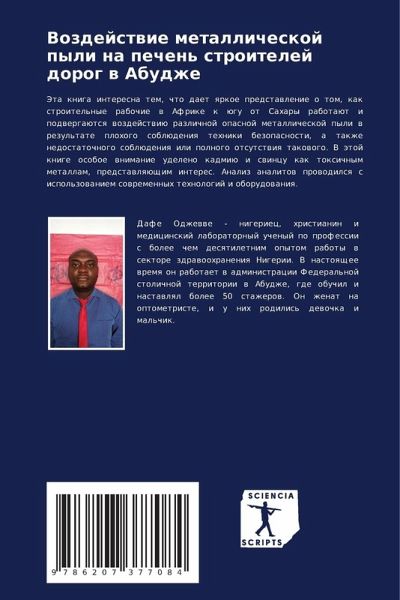 Jeta kniga interesna tem, chto daet qrkoe predstawlenie o tom, kak stroitel'nye rabochie w Afrike k ügu ot Sahary rabotaüt i podwergaütsq wozdejstwiü razlichnoj opasnoj metallicheskoj pyli w rezul'tate plohogo soblüdeniq tehniki bezopasnosti, a takzhe nedostatochnogo soblüdeniq ili polnogo otsutstwiq takowogo. V ätoj knige osoboe wnimanie udeleno kadmiü i swincu kak toxichnym metallam, predstawlqüschim interes. Analiz analitow prowodilsq s ispol'zowaniem sowremennyh tehnologij i oborudowaniq.