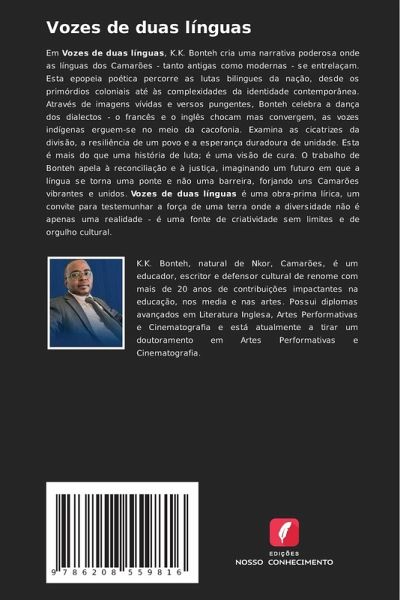 Em Vozes de duas línguas, K.K. Bonteh cria uma narrativa poderosa onde as línguas dos Camarões - tanto antigas como modernas - se entrelaçam. Esta epopeia poética percorre as lutas bilingues da nação, desde os primórdios coloniais até às complexidades da identidade contemporânea. Através de imagens vívidas e versos pungentes, Bonteh celebra a dança dos dialectos - o francês e o inglês chocam mas convergem, as vozes indígenas erguem-se no meio da cacofonia. Examina as cicatrizes da divisão, a resiliência de um povo e a esperança duradoura de unidade. Esta é mais do que uma história de luta; é uma visão de cura. O trabalho de Bonteh apela à reconciliação e à justiça, imaginando um futuro em que a língua se torna uma ponte e não uma barreira, forjando uns Camarões vibrantes e unidos. Vozes de duas línguas é uma obra-prima lírica, um convite para testemunhar a força de uma terra onde a diversidade não é apenas uma realidade - é uma fonte de criatividade sem limites e de orgulho cultural.