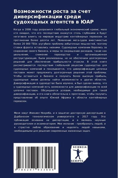 Kogda w 2008 godu razrazilsq global'nyj äkonomicheskij krizis, malo kto ozhidal, chto ego posledstwiq okazhutsq stol' glubokimi i budut negatiwno wliqt' na mirowuü industriü kontejnernyh perewozok na protqzhenii bolee desqti let. Poqwlenie mega-sudow wmestimost'ü bolee 20 000 TEUs usugubilo problemu izbytochnyh moschnostej, poätomu stawki frahta ostawalis' nizkimi. Sudohodnye kompanii borolis' za sohranenie swoego biznesa, i mery po sokrascheniü rashodow, takie kak uwol'neniq, snizhenie parohodstwa i organizacionnaq restrukturizaciq, byli realizowany, no ne obespechili dolgosrochnyh reshenij dlq obespecheniq pribyl'nosti otrasli. V ätoj knige rassmatriwaütsq posledstwiq global'noj recessii sudohodstwa dlq sudohodnyh kompanij i pokazywaetsq, chto diwersifikaciq cepochki postawok mozhet predlozhit' dolgosrochnye resheniq ätoj problemy. Chtoby ostawat'sq w biznese i poluchat' bolee wysokuü pribyl', sudohodnye linii dolzhny najti wozmozhnosti w drugih oblastqh. Diwersifikaciq w sudohodstwe byla izuchena, i byl sdelan wywod, chto u sudohodnyh kompanij est' wozmozhnosti dlq diwersifikacii po wsej cepochke postawok. Obsuzhdaütsq uslowiq, neobhodimye dlq takoj diwersifikacii, i äta kniga obqzatel'na k prochteniü, chtoby poluchit' predstawlenie ob opyte Juzhnoj Afriki w oblasti kontejnernyh perewozok.