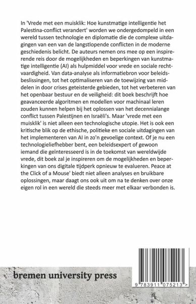 In 'Vrede met een muisklik: Hoe kunstmatige intelligentie het Palestina-conflict verandert' worden we ondergedompeld in een wereld tussen technologie en diplomatie die de complexe uitdagingen van een van de langstlopende conflicten in de moderne geschiedenis belicht. De auteurs nemen ons mee op een inspirerende reis door de mogelijkheden en beperkingen van kunstmatige intelligentie (AI) als hulpmiddel voor vrede en sociale rechtvaardigheid. Van data-analyse als informatiebron voor beleidsbeslissingen, tot het optimaliseren van de toewijzing van middelen in door crises geteisterde gebieden, tot het verbeteren van het openbaar bestuur en de veiligheid: dit boek beschrijft hoe geavanceerde algoritmen en modellen voor machinaal leren zouden kunnen helpen bij het oplossen van het decennialange conflict tussen Palestijnen en Israëli's. Maar 'vrede met een muisklik' is niet alleen een technologische utopie. Het is ook een kritische blik op de ethische, politieke en sociale uitdagingen van het implementeren van AI in zo'n gevoelige context. Of je nu een technologieliefhebber bent, een beleidsexpert of gewoon iemand die geïnteresseerd is in de toekomst van wereldwijde vrede, dit boek zal je inspireren om de mogelijkheden en beperkingen van ons digitale tijdperk opnieuw te evalueren. Peace at the Click of a Mouse' biedt niet alleen analyses en bruikbare oplossingen, maar daagt ons ook uit om na te denken over onze eigen rol in een wereld die steeds meer met elkaar verbonden is.