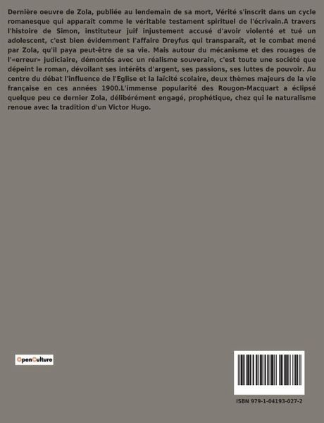 Émile Zola nous transporte dans l'univers complexe de la Troisième République française, où les tensions politiques et sociales sont à leur comble. ' Vérité Livre 3 ' s'inscrit dans une époque marquée par des luttes idéologiques intenses et des bouleversements sociaux. Au cur de cette fresque se trouve l'affaire Dreyfus, un scandale judiciaire qui divise la nation et met en lumière les préjugés et les injustices de l'époque. Zola, avec sa plume acérée, dépeint une société en proie à ses contradictions, où la quête de vérité devient un combat acharné contre l'obscurantisme et l'intolérance. Les personnages de Zola, mi-humains mi-symboliques, évoluent dans un cadre où les valeurs républicaines sont mises à l'épreuve. L'auteur explore les thèmes de la justice, de la vérité et de la moralité, tout en questionnant les institutions et les structures de pouvoir. À travers une analyse minutieuse des comportements humains, Zola nous invite à réfléchir sur les mécanismes de la société et les forces qui la façonnent. En développant une intrigue riche et pleine de rebondissements, ce livre nous apprend à mieux comprendre les enjeux de l'époque et les défis auxquels sont confrontés les individus en quête de justice. Par son écriture incisive et son regard critique, Zola nous offre une perspective éclairante sur les luttes pour la vérité et la justice, nous permettant de percevoir les répercussions de ces combats sur notre société contemporaine.
