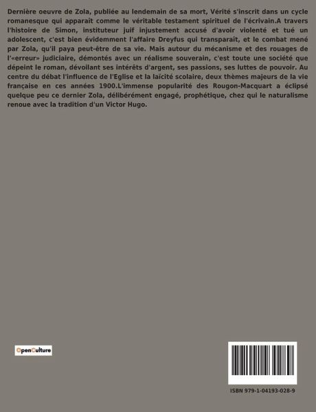 Dernière oeuvre de Zola, publiée au lendemain de sa mort, Vérité s'inscrit dans un cycle romanesque qui apparaît comme le véritable testament spirituel de l'écrivain.A travers l'histoire de Simon, instituteur juif injustement accusé d'avoir violenté et tué un adolescent, c'est bien évidemment l'affaire Dreyfus qui transparaît, et le combat mené par Zola, qu'il paya peut-être de sa vie. Mais autour du mécanisme et des rouages de l'«erreur» judiciaire, démontés avec un réalisme souverain, c'est toute une société que dépeint le roman, dévoilant ses intérêts d'argent, ses passions, ses luttes de pouvoir. Au centre du débat l'influence de l'Eglise et la laïcité scolaire, deux thèmes majeurs de la vie française en ces années 1900.L'immense popularité des Rougon-Macquart a éclipsé quelque peu ce dernier Zola, délibérément engagé, prophétique, chez qui le naturalisme renoue avec la tradition d'un Victor Hugo.