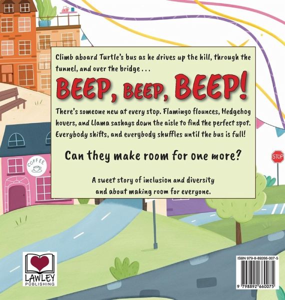 Climb aboard Turtle's bus as he drives up the hill, through the tunnel, and over the bridge. BEEP, BEEP, BEEP. There's someone new at every stop. Flamingo flounces, Hedgehog hovers, and Llama sashays down the aisle to find the perfect spot. Everybody shifts, and everybody shuffles until the bus is full! Can they make room for one more? A sweet story of inclusion and diversity and about making room for everyone.