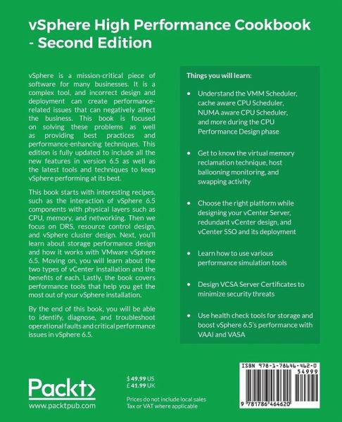 Over 80 recipes to help you improve vSphere 6.5's performance and solve problems before they arise Key FeaturesThe practical recipes provide cost-effective and high performance for any application running in a virtual machine Contains best practices and troubleshooting techniques to resolve vSphere 6.5 performance issues Get a comprehensive coverage of performance issues and solutions including vCenter Server design and virtual machine and application tuning Book Description vSphere is a mission-critical piece of software for many businesses. It is a complex tool, and incorrect design and deployment can create performance related issues that can negatively affect the business. This book is focused on solving these problems as well as providing best practices and performance-enhancing techniques. This edition is fully updated to include all the new features in version 6.5 as well as the latest tools and techniques to keep vSphere performing at its best. This book starts with interesting recipes, such as the interaction of vSphere 6.5 components with physical layers such as CPU, memory, and networking. Then we focus on DRS, resource control design, and vSphere cluster design. Next, you'll learn about storage performance design and how it works with VMware vSphere 6.5. Moving on, you will learn about the two types of vCenter installation and the benefits of each. Lastly, the book covers performance tools that help you get the most out of your vSphere installation. By the end of this book, you will be able to identify, diagnose, and troubleshoot operational faults and critical performance issues in vSphere 6.5. What You Will LearnUnderstand the VMM Scheduler, cache aware CPU Scheduler, NUMA aware CPU Scheduler, and more during the CPU Performance Design phase Get to know the virtual memory reclamation technique, host ballooning monitoring, and swapping activity Choose the right platform while designing your vCenter Server, redundant vCenter design, and vCenter SSO and its deployment Learn how to use various performance simulation tools Design VCSA Server Certificates to minimize security threats Use health check tools for storage and boost vSphere 6.5's performance with VAAI and VASA Who This Book Is For If you are a system administrator and are planning to deploy vSphere 6.5 in your organization and want to maximize its performance, then this book is for you. Prior knowledge of the vSphere 6.5 concepts is essential.