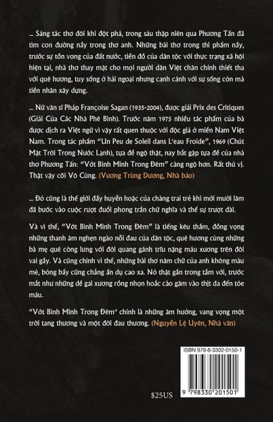 ...¿ó c¿ng là th¿ gi¿i ¿¿y huy¿n höc c¿a chàng trai tr¿ khi m¿i m¿¿i l¿m ¿ã b¿¿c vào cüc r¿¿t ¿üi phong tr¿n ch¿ ngh¿a và th¿ s¿ tr¿¿t dài. Và vì th¿, "V¿t Bình Minh Trong ¿êm" là ti¿ng kêu th¿m, ¿¿ng v¿ng nh¿ng thanh âm ngh¿n ngào n¿i ¿au c¿a dân t¿c, quê h¿¿ng cùng nh¿ng bà m¿ quê còng l¿ng v¿i ¿ôi quang gánh tr¿u n¿ng máu x¿¿ng trên ¿ôi vai g¿y. Và c¿ng chính vì th¿, nh¿ng bài th¿ n¿m ch¿ c¿a anh không màu mè, bóng b¿y c¿ng ch¿ng ¿n d¿ cao xa. Nó th¿t g¿n trong t¿m v¿i, tr¿¿c m¿t nh¿ nh¿ng d¿ gai x¿¿ng r¿ng nh¿n höc cào g¿m vào th¿t da ¿¿n tóe máu. "V¿t Bình Minh Trong ¿êm" chính là nh¿ng âm h¿¿ng, vang v¿ng m¿t tr¿i tang th¿¿ng và m¿t ¿¿i ¿au th¿¿ng. (Nguy¿n L¿ Uyên, Nhà v¿n)