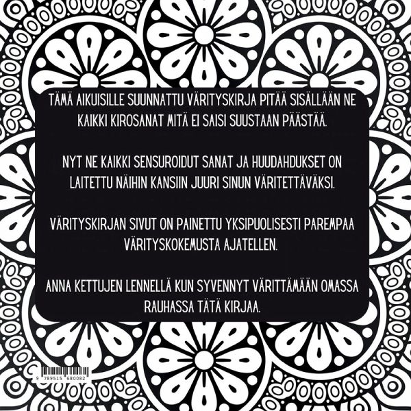 Tämä aikuisten värityskirja pitää sisällään geometrisia kuvioita, mandala-kuvioita ja ärsyttäviä koukeroita. Mutta mitä olisi v*tutusvärityskirja ilman kirosanoja? Jokainen mandala ja jokainen muukin sivu on höystetty kirosanoilla. Kirosanavärityskirja oli liian pitkä kanteen ja muutenkin kirjan nimi soljuu mukavasti suusta ulos. Niinkuin ne kirosanatkin.