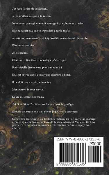 J'ai reçu l'ordre de l'exécuter... Je ne m'attendais pas à la revoir. Nous avons partagé une nuit sauvage il y a plusieurs années. Elle ne savait pas que je travaillais pour la mafia. Je suis un tueur sauvage et impitoyable, mais elle est innocente. Elle sauve des vies. Je les prends. C'est une infirmière en oncologie pédiatrique. Pourrait-elle être encore plus une sainte ? Elle est entrée dans la mauvaise chambre d'hôtel. Il ne doit pas y avoir de témoins. Mon patron la veut morte. Sa vie est entre mes mains. J'ai l'intention d'en faire ma femme pour la protéger. Elle me détestera, mais au moins je pourrai la protéger. Cette romance secrète sur les bébés mafieux met en scène un mariage arrangé et est le troisième livre de la série Mariages Mafieux. Ce livre peut être lu de façon autonome et se termine par un « happy ever after. »