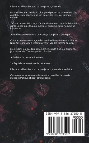 Elle veut sa liberté et tout ce que je veux, c'est elle... Nicole DeLuca est la fille du plus grand patron du crime de la côte ouest. Ai-je mentionné que son père, Gino DeLuca, est mon ennemi ? J'ai couché avec Nikki et je n'arrive absolument pas à l'oublier. J'ai gardé un œil sur elle, pour m'assurer qu'aucun autre homme ne l'approche. Je les chasserai comme la bête que je suis pour la protéger. Comme un oiseau en cage, elle cherche désespérément la liberté. Nikki fait le mur, mais se fait enlever et vendre comme épouse. Même dans la pièce la plus sombre, le coin le plus sale du monde, je la reconnais. C'est ma petite colombe. Je l'achète. La possède. La sauve. Sauf qu'elle ne le voit pas de cette façon... Elle veut sa liberté et tout ce que je veux, c'est elle et ce bébé. Cette sombre romance mafieuse est la première de la série Mariages Mafieux et peut être lue seule.